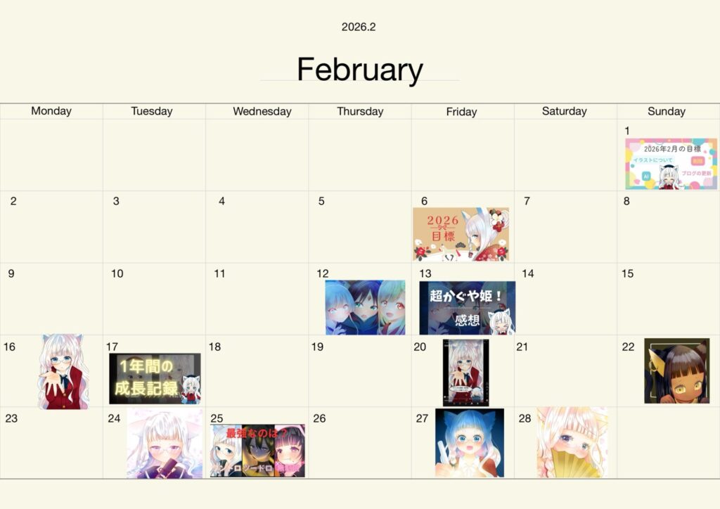 今回は、2026年2月の創作活動の振り返りと、3月に向けたイラストの目標についてまとめていきます。