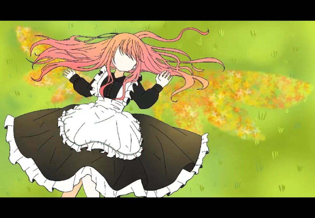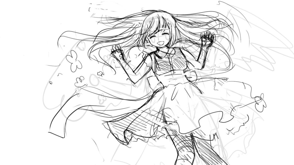最初のラフでは、メイド服のデザインだけ決まっていて、 木漏れ日ではなく 花びらで天使の羽を表現する案 を考えていました。