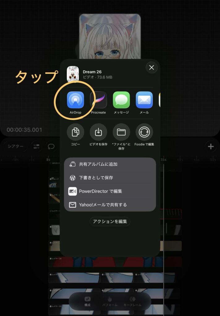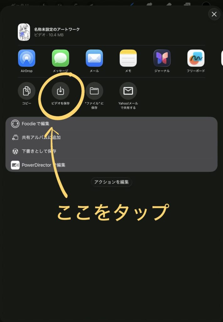 今回はiPadで編集をするので「ビデオを保存」をタップします。
