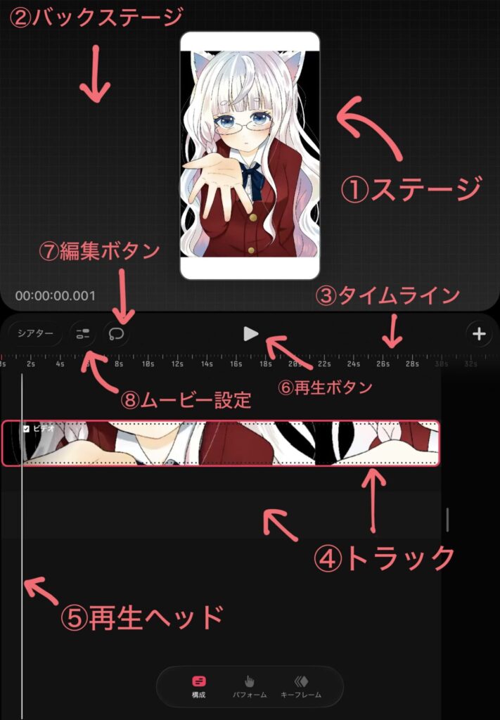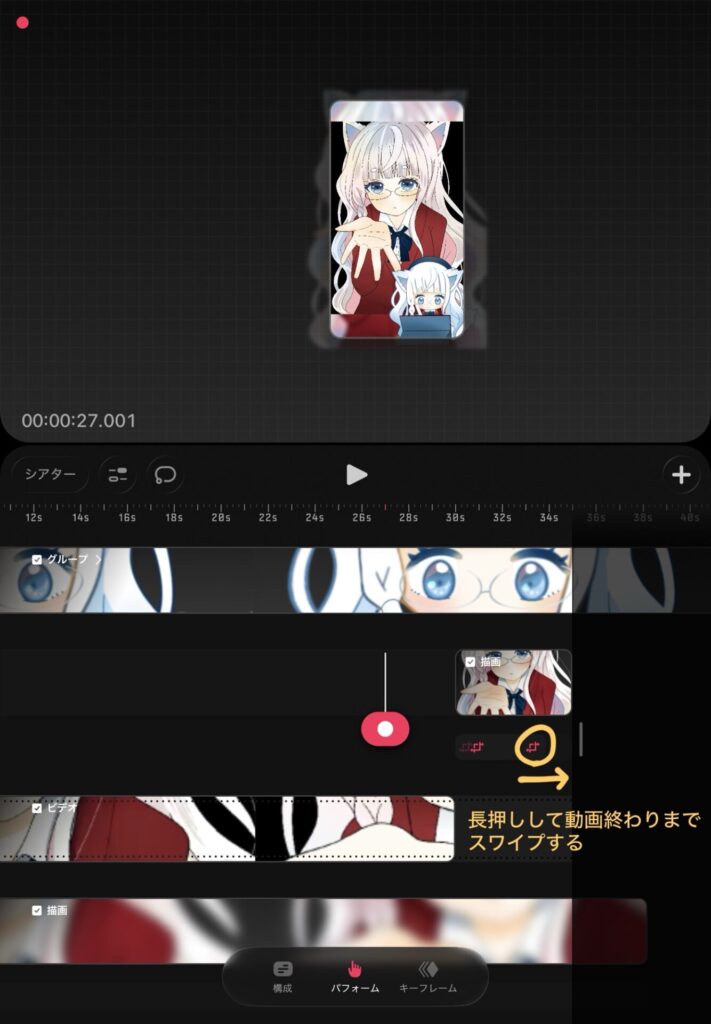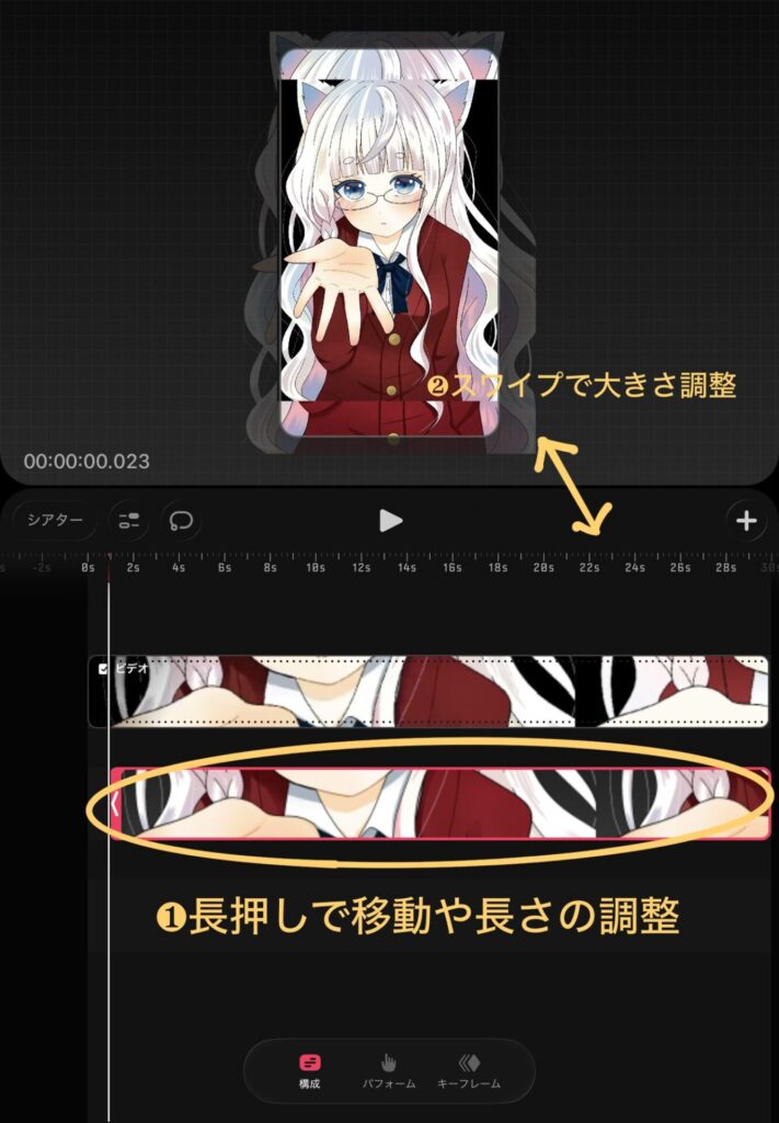 トラック右側の赤い矢印を移動させることで動画で表示させる長さを調整することができます。