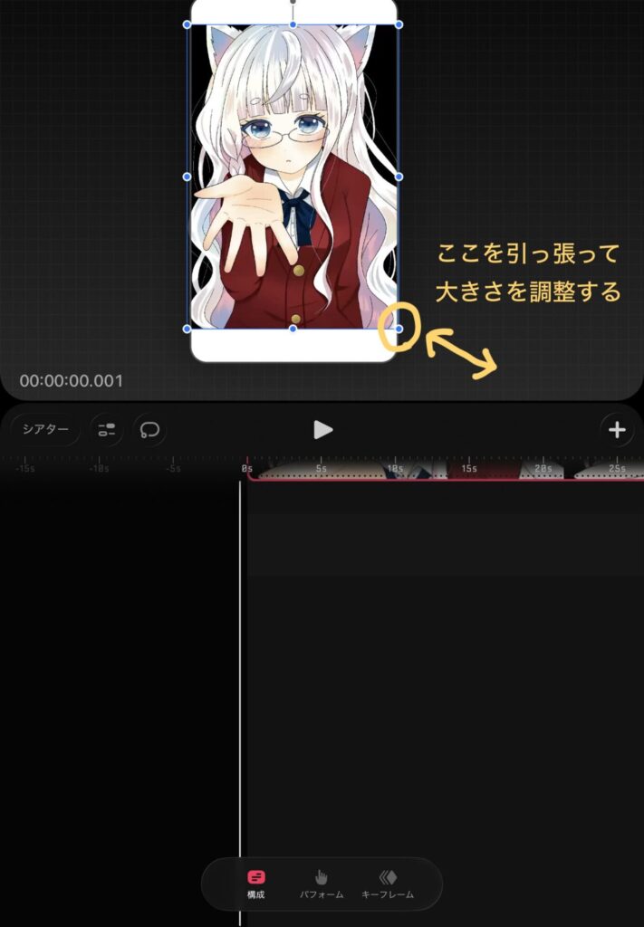 大きさがステージに合っていないため、右下のを青い丸をスワイプして大きさの調整をします。