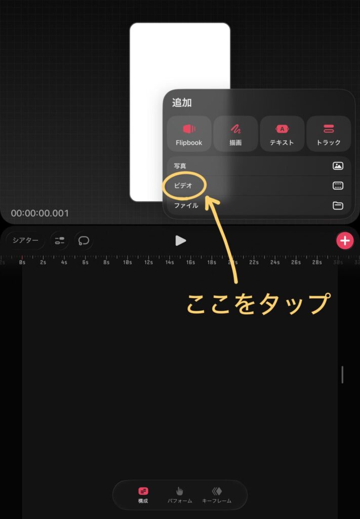 追加画面が出てくるので、ビデオをタップします。