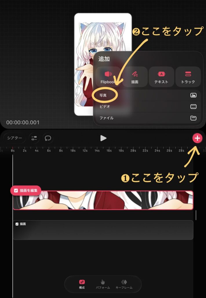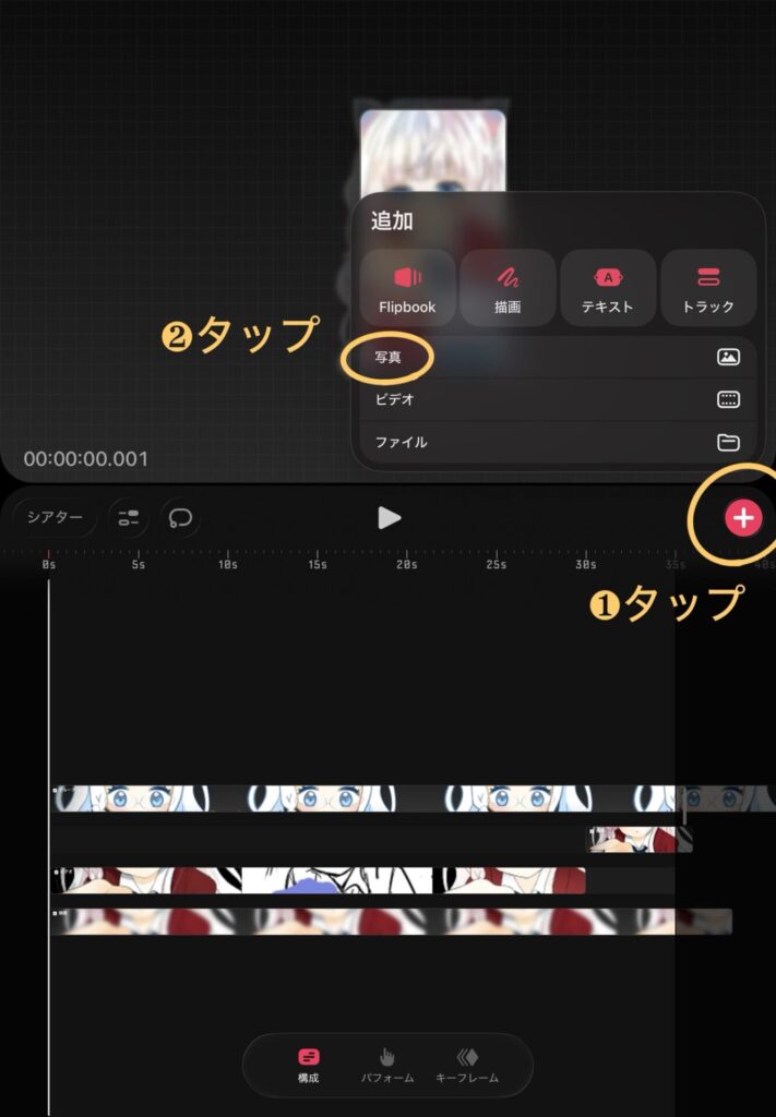 ビデオを挿入した時のように「+」ボタンをタップし、「写真」を選択します。