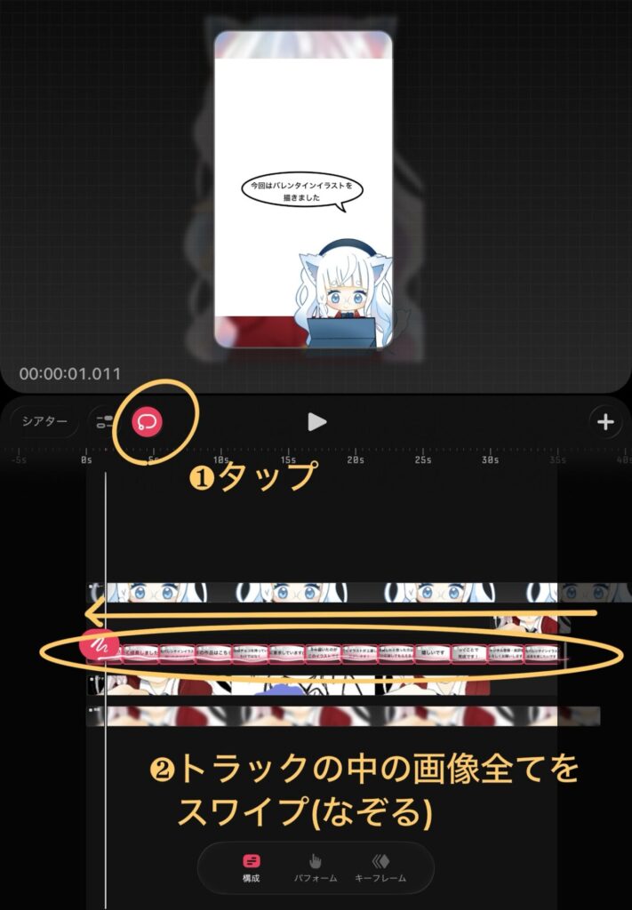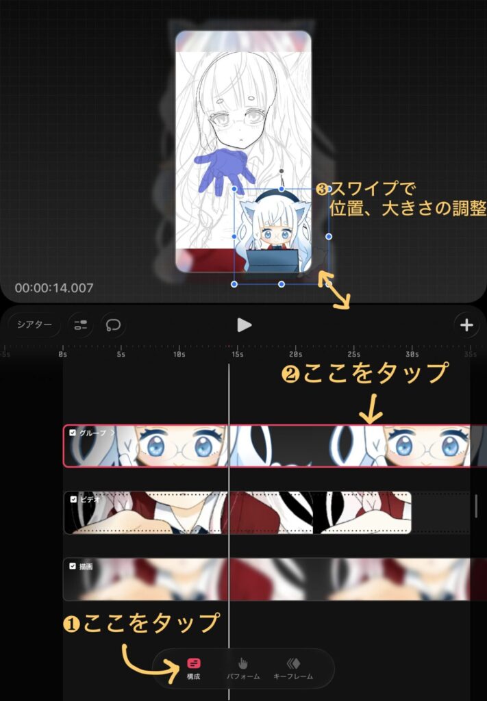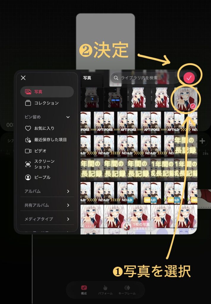 ❶の場所をタップして、❷のように先ほど加えた画像をなぞります。