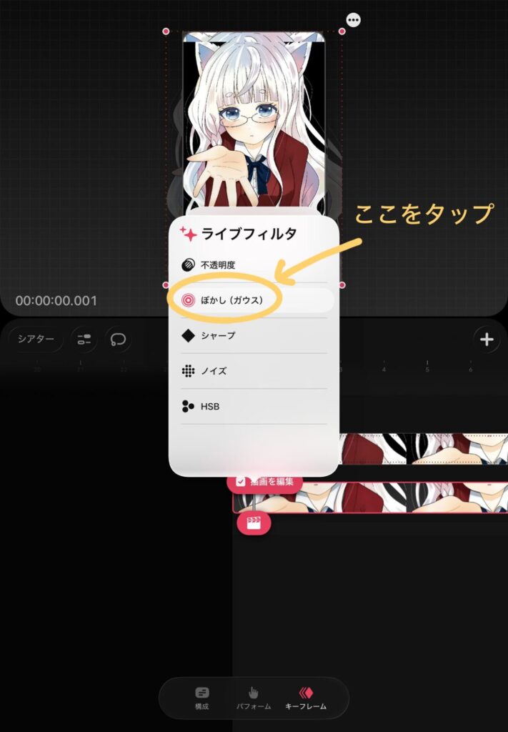ライブフィルタの中にある「ぼかし(ガウス)」をタップ。