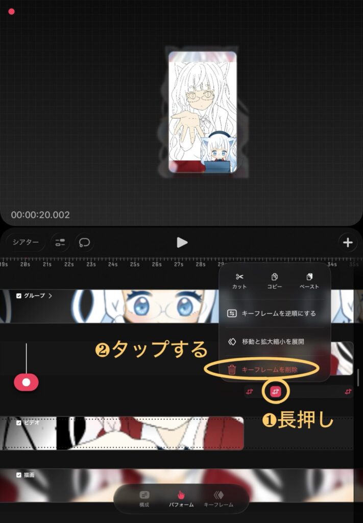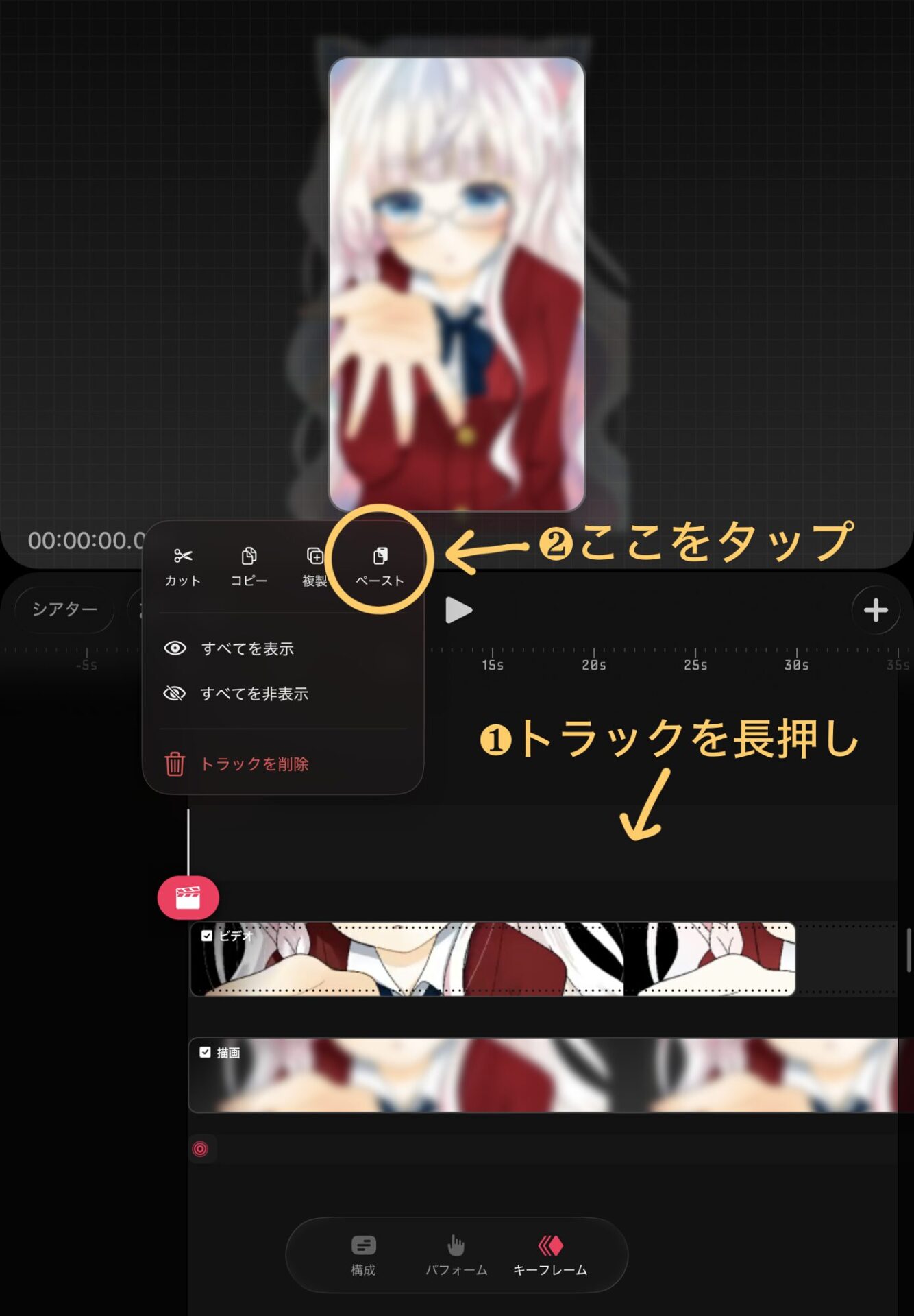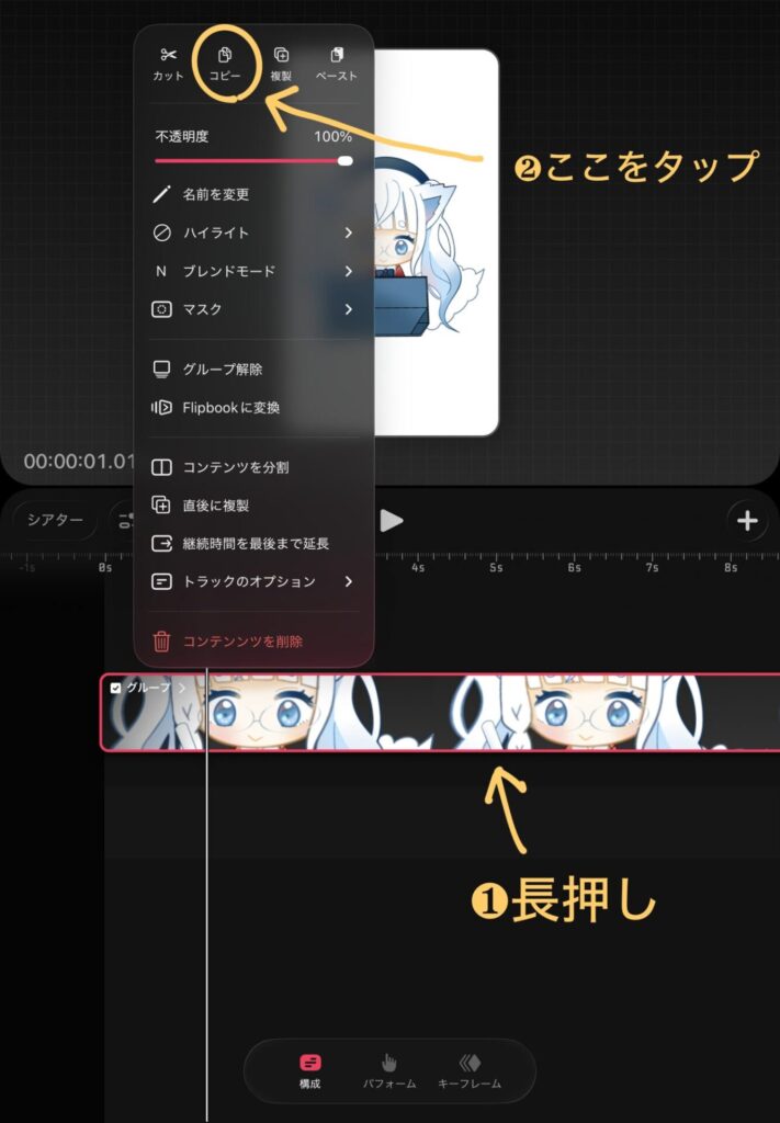 アニメーションのトラックを長押しすることし、「コピー」をタップします。