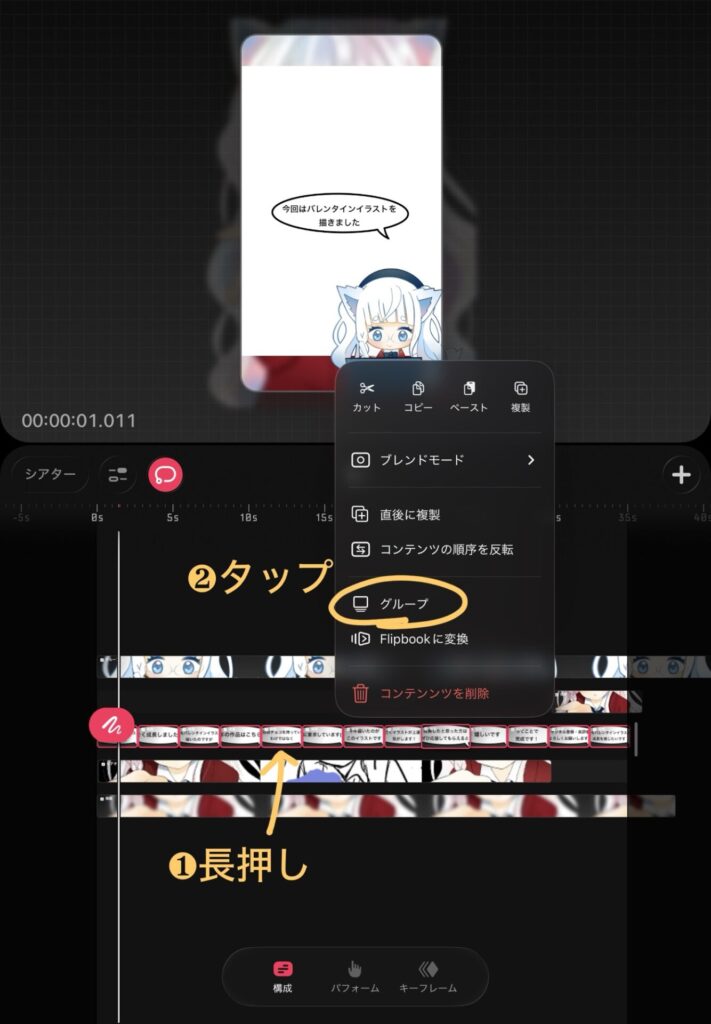 ❶画像のトラックを長押しし❷の「グループ」をタップします。