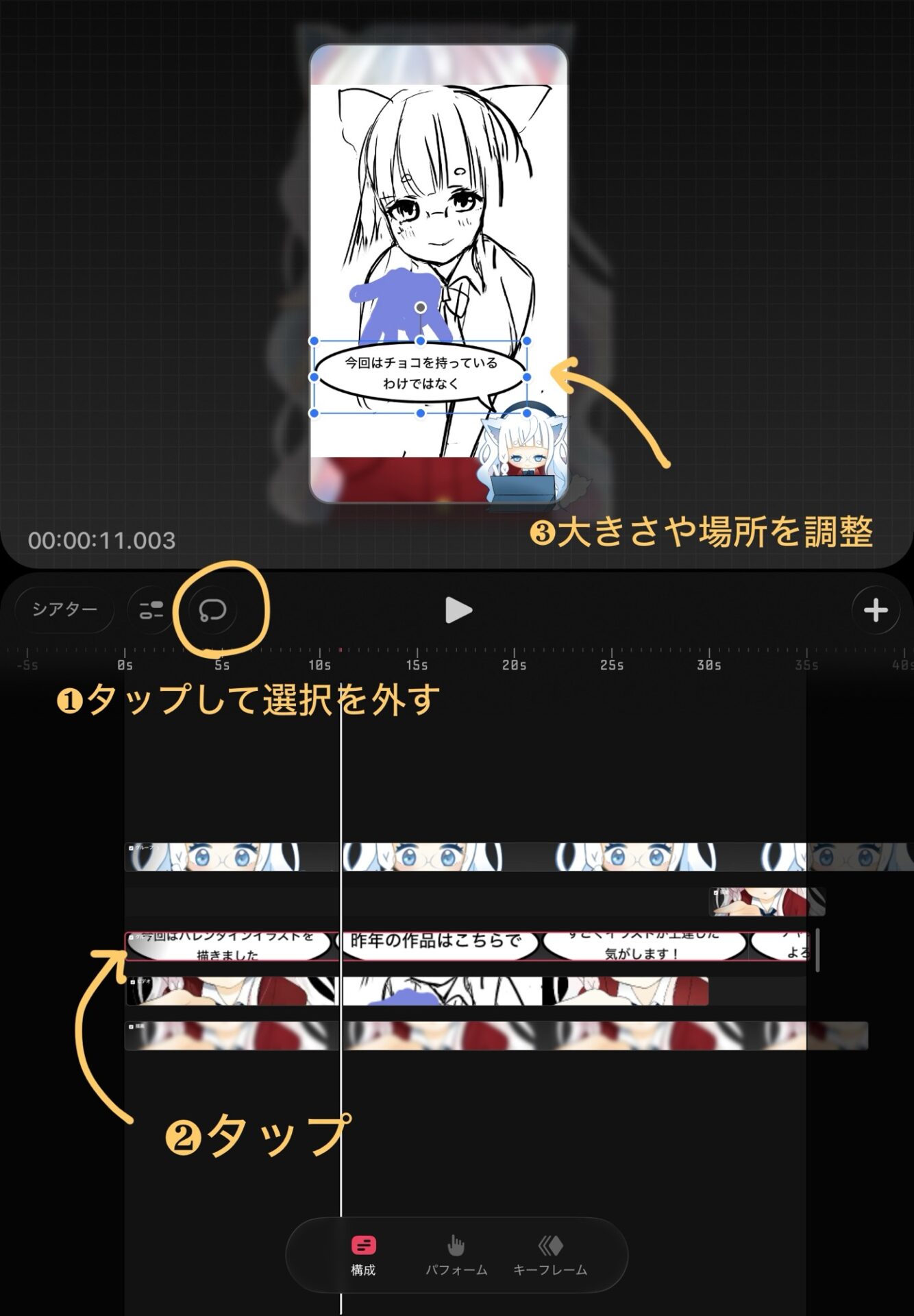 ❶~❸の順番にアニメーションの位置や大きさなどの調整を行います。