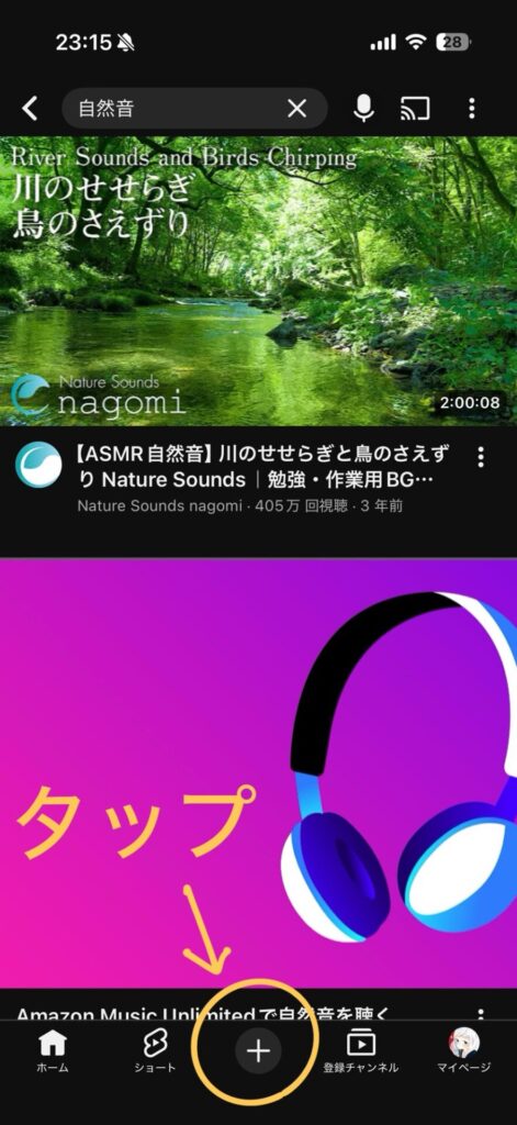 YouTubeを開き、下にある「+」をタップします。