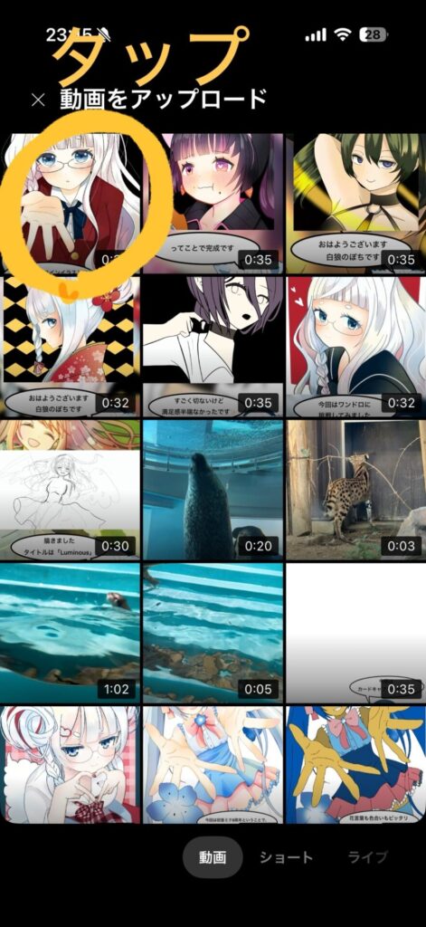 最後に一番下の「ショート動画をアップロード」をタップします。