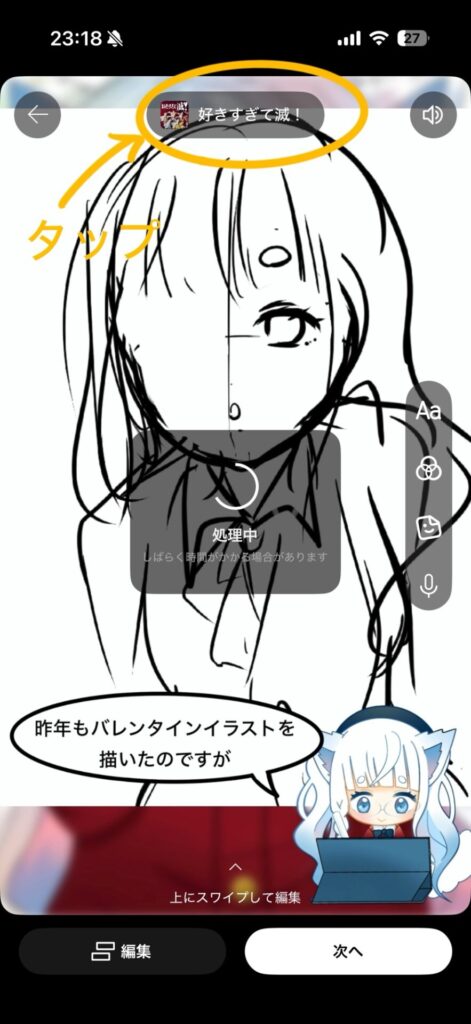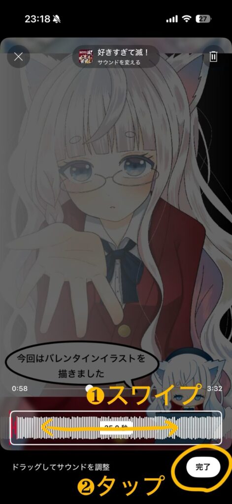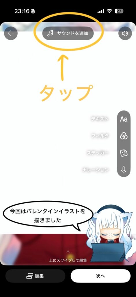 音楽を付けたいので、上側にある「サウンドを追加」をタップします。