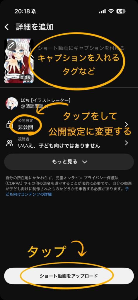 キャプションの中に動画のキャプションやタグを入力して公開設定をします。