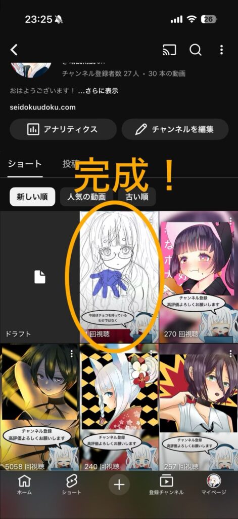 ショートの一覧に先ほどの動画がUPされたら完了です。